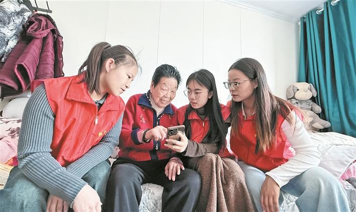 3月18日,九师朝阳新区军垦路社区志愿者走进独居老人陈友兰(左二)家中,教老人使用智能手机。兵团日报常驻记者 苟汇敏 摄