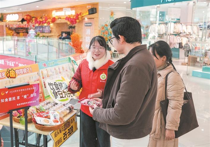 3月5日,八师石河子市2026年学雷锋志愿服务月启动仪式暨志愿服务集市主题活动举行。图为石河子大学食品学院学生志愿者在活动现场为市民科普健康饮食知识。杜鑫泉 摄