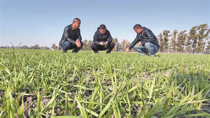 奇台农场七连“两委”成员和种植户(右)一起查看冬小麦出苗情况(资料图片)。林云 摄