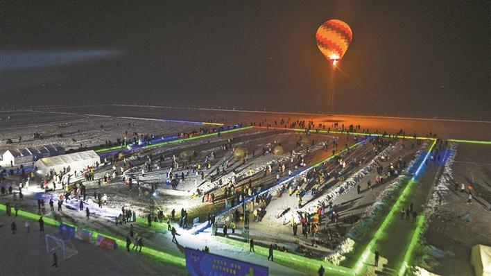 游客在六师五家渠市青格达湖国家级旅游度假区体验雪地热气球等低空旅游项目(摄于1月1日)。兵团日报常驻记者 李华北 摄
