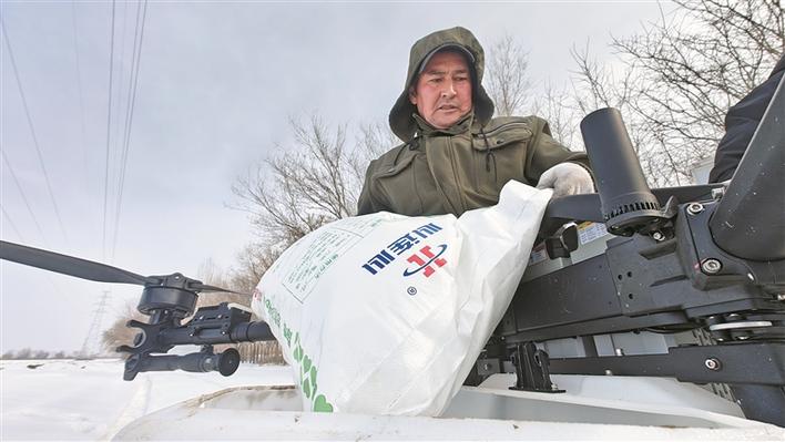3月12日,在七师一三〇团十七连的冬小麦地头,职工为植保无人机装载肥料,为施肥作业作准备。宋亚丽 王子恒 摄