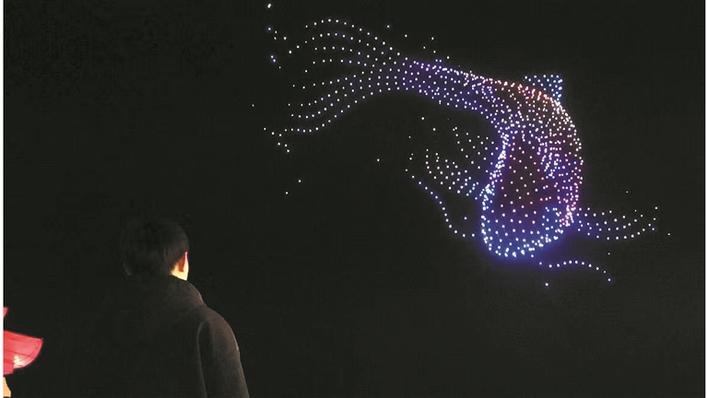 3月3日,游客在十三师新星市新星湖广场观看无人机表演。兵团日报常驻记者 李欣奕 摄