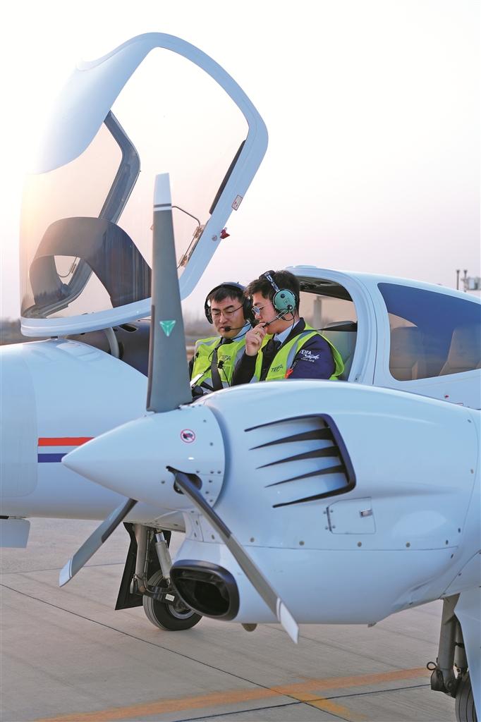 在天山雄鹰国际飞行学院,DA-42NG双发教练机教练(右)为飞行学员讲授低空飞行技术要点(摄于1月19日)。王彬瑞 摄