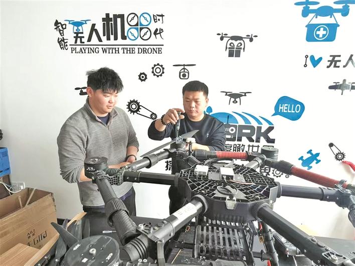 3月18日,在新疆凯兰智能科技有限公司无人机教育培训中心,工作人员(右)教学员调试无人机。兵团日报常驻记者 冯晓玲 通讯员 王兵 摄