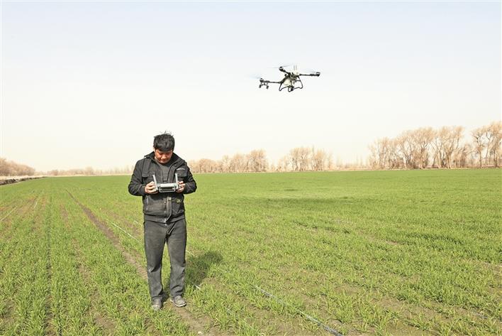 3月19日,在二师三〇团九连的一块麦田里,该连职工操作植保无人机为冬小麦施肥。张虎 摄