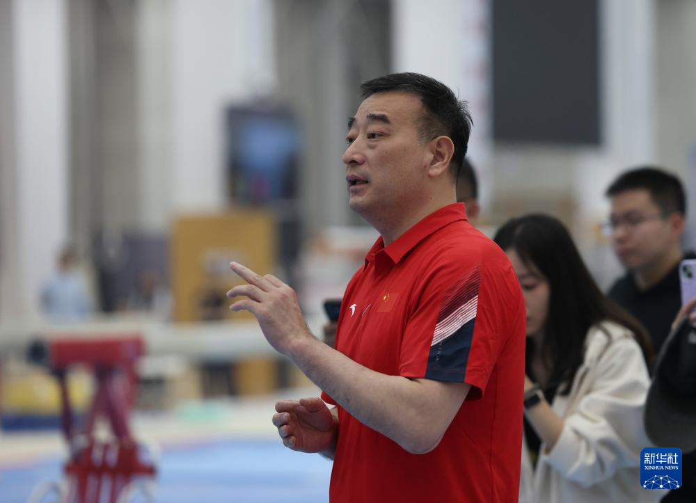 3月26日,中国国家体操队领队陆斌在测试后和队员们交流。新华社记者 王东震 摄