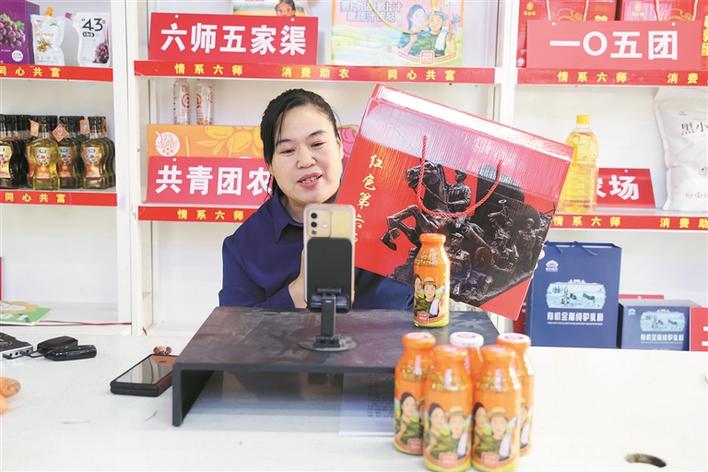 3月31日,六师五家渠市“六师印象”馆工作人员通过网络直播推介当地特色农副产品,拓宽销售渠道,助力本土好物“走出去”。杜仪 朱小丽 摄