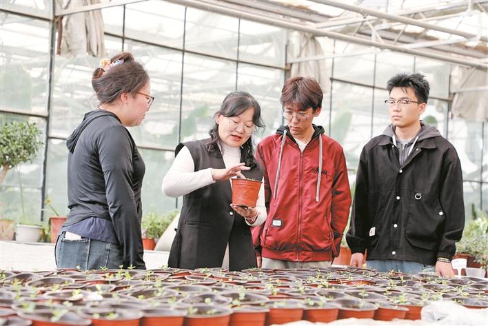 3月25日,王艳(左二)在实验苗床前向学生讲解酸枣幼苗的特性。兵团日报常驻记者 曾维 摄