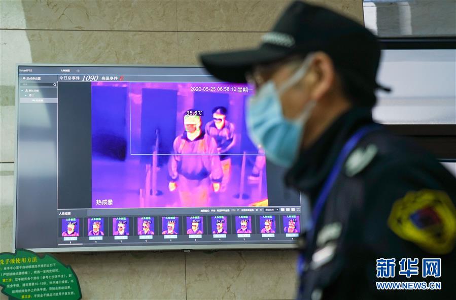 黑龙江省实验中学安保人员在教学楼入口测温设备旁值守(5月25日摄)。当日,黑龙江省高中毕业年级学生返校复课,有序展开在校学习生活。 新华社记者 王松 摄