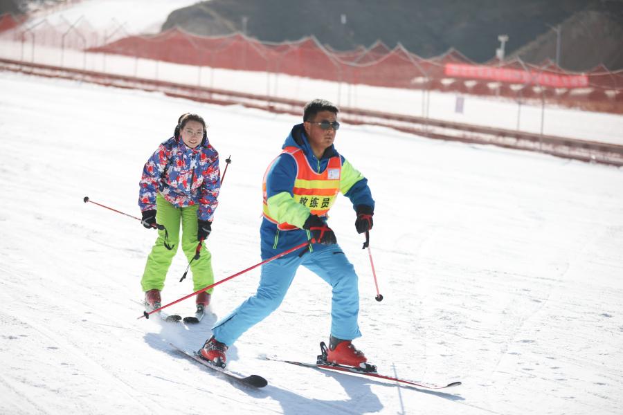 ▲ 1月8日,在甘肃白银国家雪上项目训练基地,一名教练指导滑雪爱好者滑雪。新华社记者 马希平 摄
